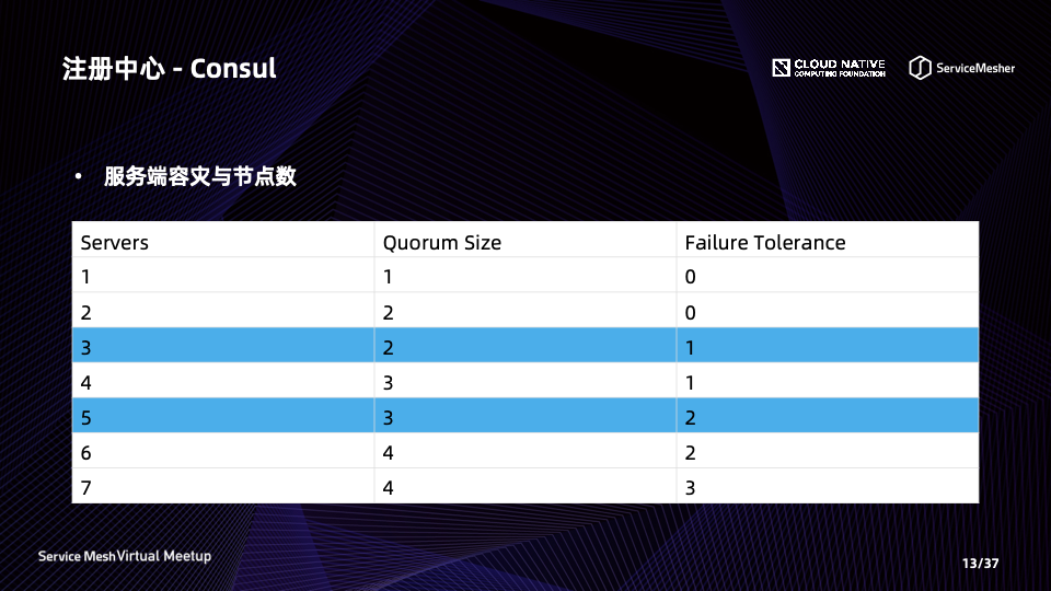 Consul 使用 Raft 协议作为其分布式一致性协议,本身对故障节点有一定的容忍性,在单个 DataCenter 中 Consul 集群中节点的数量控制在 2*n + 1 个节点,其中 n 为可容忍的宕机个数。Quorum size: Raft 协议选举需要半数以上节点写入成功。