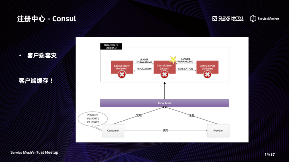 Service Mesh 在企业落地中有诸多挑战,当与传统微服务应用共同部署治理时可用性挑战更为严峻。本次分享将以 Service Mesh 与 Spring Cloud 应用互联互通共同治理为前提,着重介绍基于 Consul 的注册中心高可用方案,通过各种限流、熔断策略保证后端服务的高可用,以及通过智能路由策略(负载均衡、实例容错等)实现服务间调用的高可用。