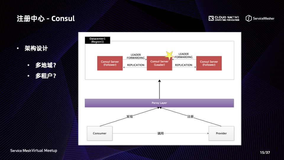 在云上环境,涉及多 region 环境,因此在架构设计设计时,我们首先将 Consul 的一个 Datacenter 对应云上一个 region,这样更符合 Consul 对于 Datecenter 的定义(DataCenter 数据中心是私有性、低延迟、高带宽的网络环境)。中间代理层实现了服务鉴权、多租户隔离等功能;还可以通过中间代理层,对接多注册中心。