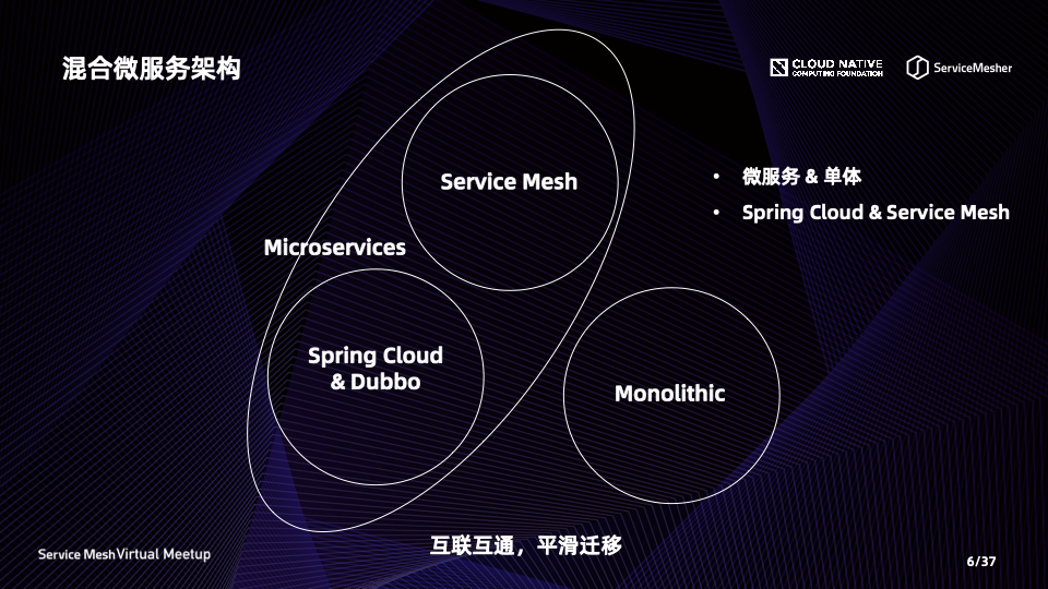 前面提到过,对于传统微服务框架 Spring Cloud 与新兴微服务框架 Service Mesh,并非是个非黑即白,非你即我,延伸到微服务与单体架构,它们也是可以共存的。