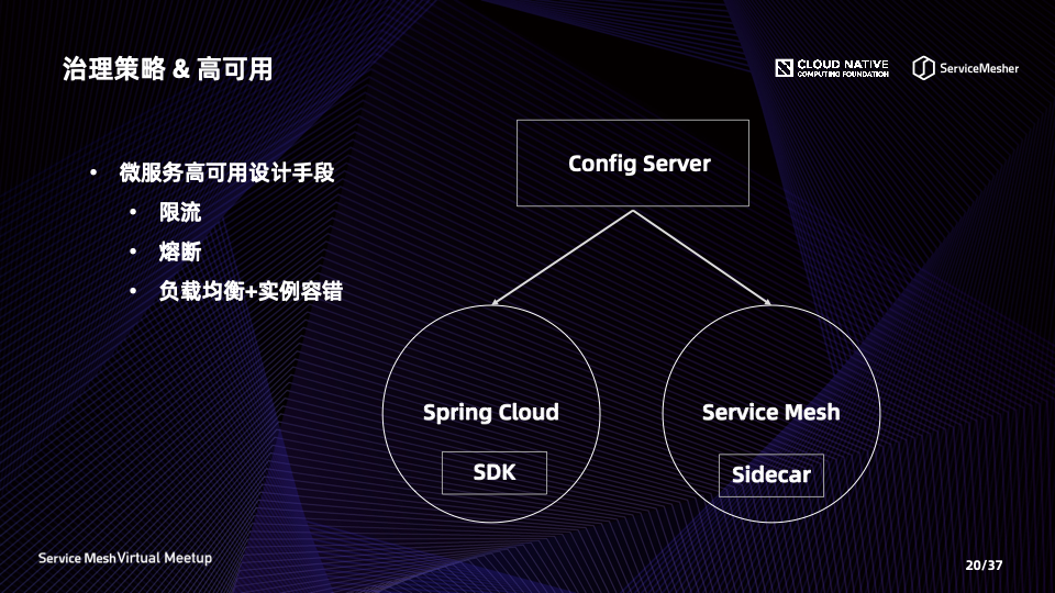 以上治理规则在某种程度上可以在 Spring Cloud 与 Service Mesh 两个框架上进行对齐,即同一套治理配置,可以通过转换分发到 Spring Cloud 应用的 SDK 上以及 Service Mesh 的 Sidecar 上。可以由 Config-server 负责规则下发,也可以由 Service Mesh 的控制面负责下发,取决于具体的架构方案。