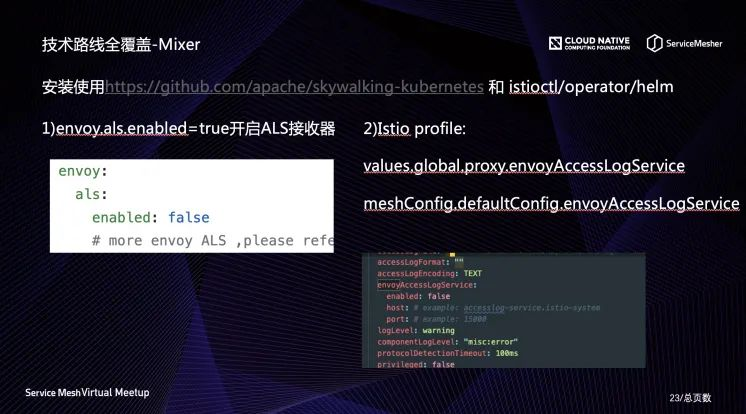 这种模式需要在安装 SkyWalking 与 Istio 时进行配置。首先在 SkyWalking 的 Helm 里将“envoy.als.enabled”设置为 true。而后安装 Istio 时,需要设置"values.global.proxy.envoyAccessLogService"为如图中的值。