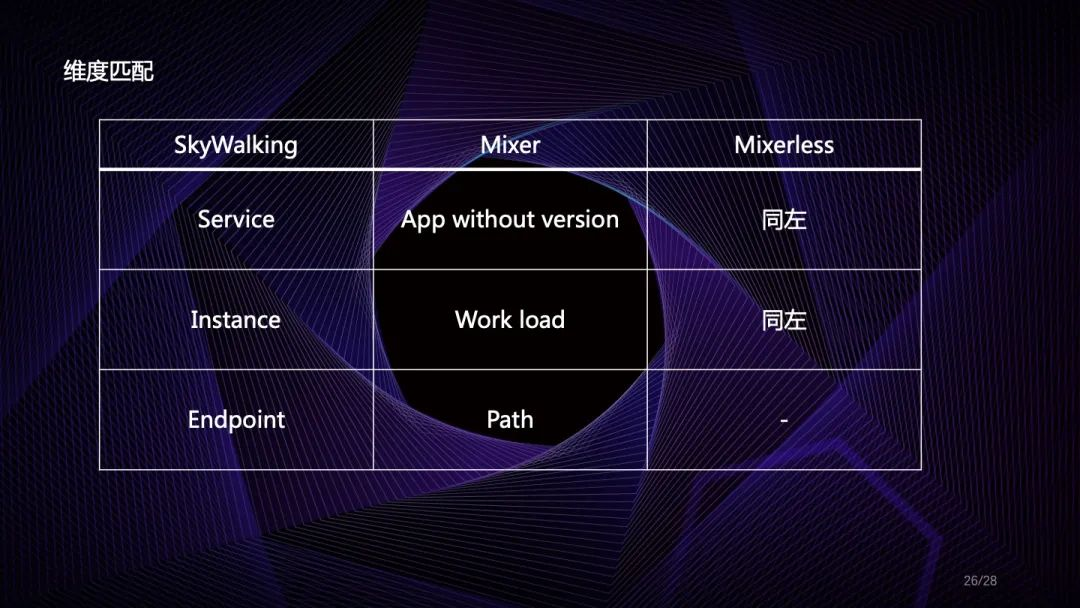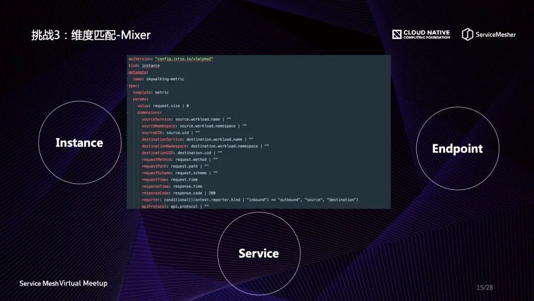 第三个挑战就是维度匹配的问题。我们从前一章可以看到 SkyWalking 是包括三个维度的,其中对于实例和端点,在 Service Mesh 场景下都是有比较好的支持。这里多说一句,不仅仅是对 Mesh 场景,对于大部分场景都可以很好的去匹配它们。但是对于服务的匹配是有相当大难度的,因为 SkyWalking 只有服务这一层的概念,而在 Istio 中有好几个概念可以称之为“服务”。如何才能进行相关的维度匹配,特别是对于服务级别的维度匹配,成为了 Service Mesh 是如何与 SkyWalking 结合的另一个关键点。