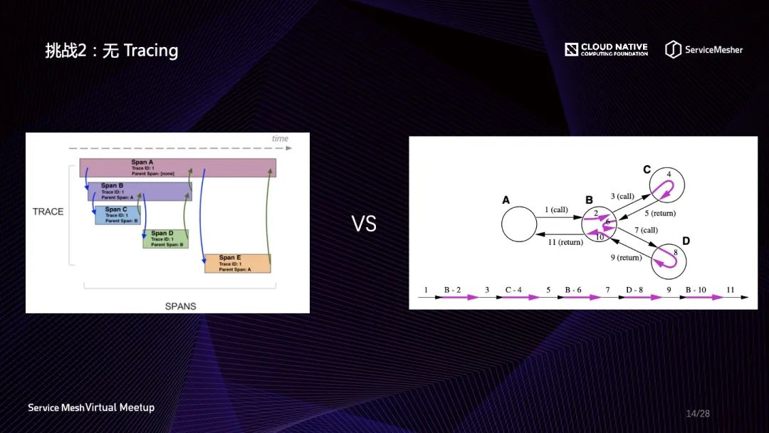 第二个挑战就是无 Tracing 数据。SkyWalking 最早是为了收集处理跟踪数据(Tracing)而设计的一套系统,但是我们可以从右边的图发现,对于 Service Mesh 上报的数据其实是基于调用的,也就是说它不存在一条完整的跟踪链路。这样就对后台的分析模型有比较大的挑战,如何才能同时支持好这两种模式成为后端分析系统所要处理的棘手问题。