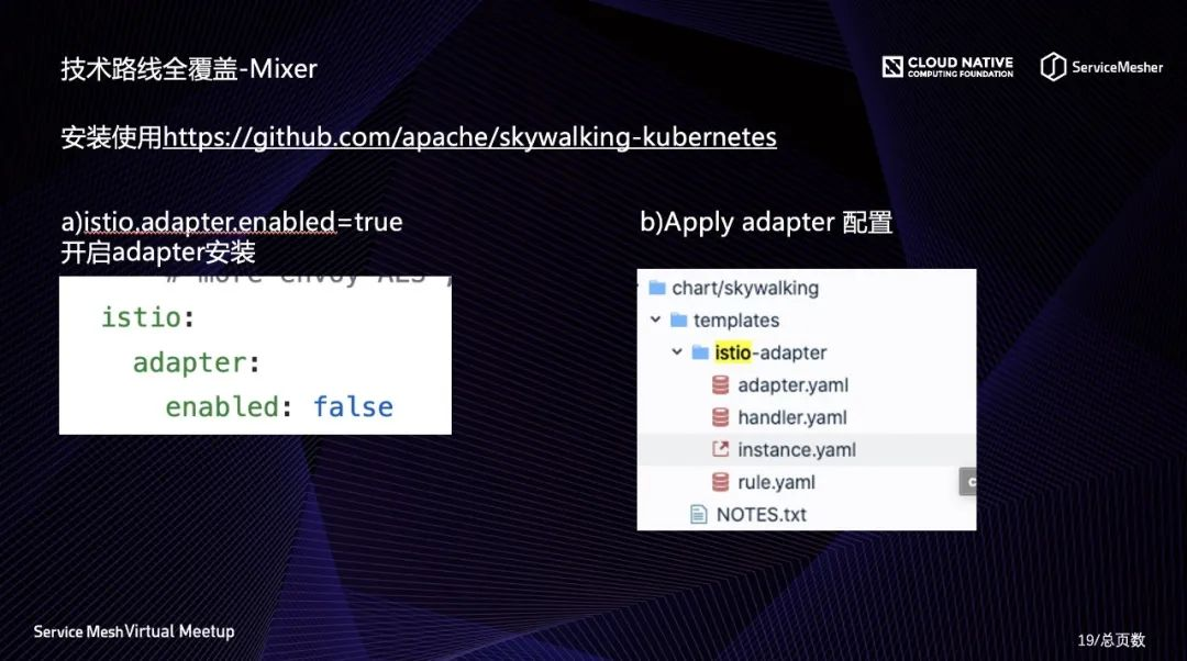 如果从 Helm Chart 安装 SkyWalking,可以在 values.yml 文件中将如图的参数设置为 true。而后 Helm 会自动安装 SkyWalking 分析后台,并将它以进程外适配器的模式集成到 Istio 中;