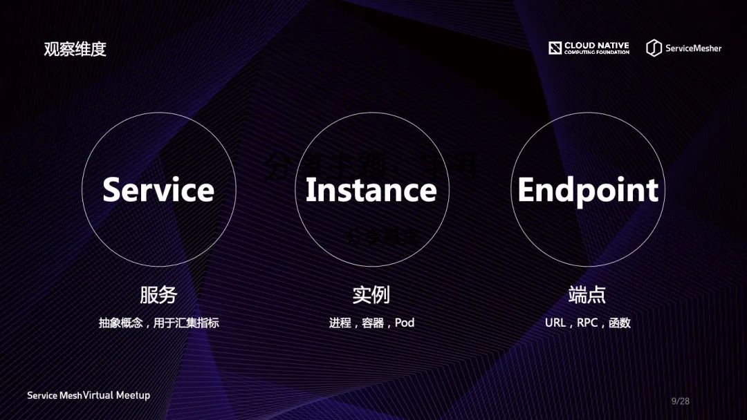 实例(Instance):上述的一组工作负载中的每一个工作负载称为一个实例。就像 Kubernetes 中的 Pod 一样, 服务实例未必就是操作系统上的一个进程。但当你在使用打点代理的时候,一个服务实例实际就是操作系统上的一个真实进程。