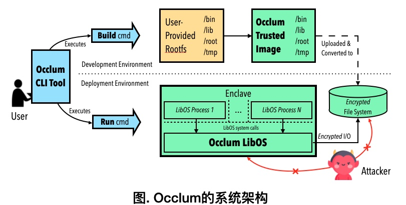 简单的用户接口隐藏着复杂的实现细节。为了高层次地描述 Occlum 的技术原理,我们分可信的开发环境和不可信的部署环境两个视角来讨论。