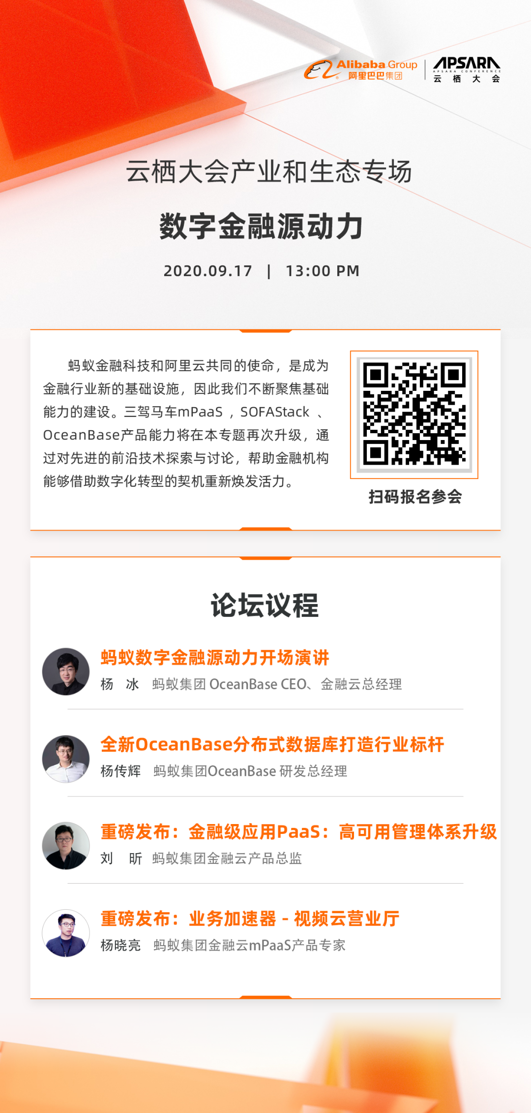 对于传统的金融机构而言,该如何构建深度融合的技术创新体系,更好推动数字化转型?在9月17日下午13点云栖大会数字金融源动力专场分论坛中,蚂蚁金融科技将发布“三驾马车”企业级分布式关系数据库 OceanBase、移动开发平台mPaaS 和金融级分布式架构 SOFAStack 的全新能力。