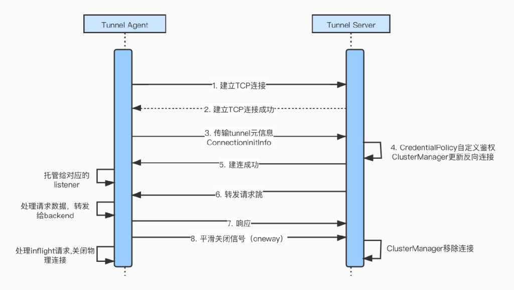 1.边缘侧的 MOSN 实例(后文统称为 Tunnel Agent)在启动时 Tunnel Agent 相关服务协程。
