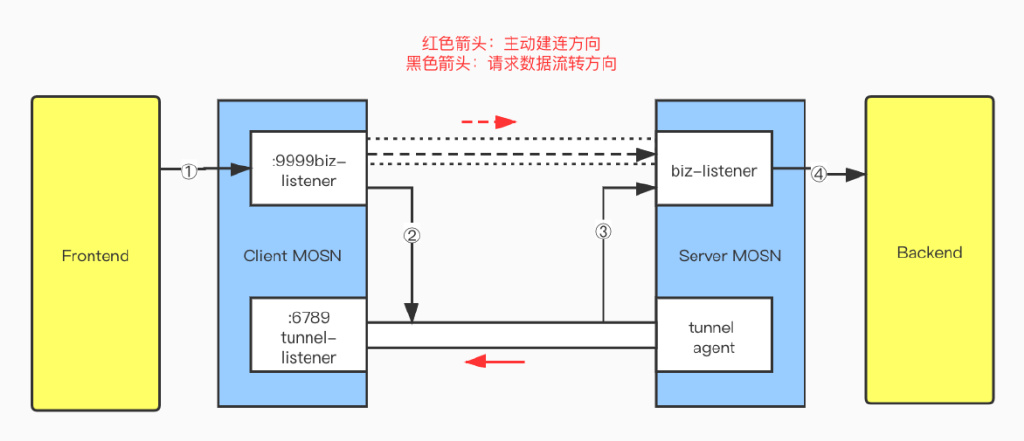 在传统的 MOSN Sidecar 应用场景中,Frontend 发送的请求首先经过 Client-MOSN,然后通过路由模块,主动创建连接(虚线部分)并流转到对端,经由 Server-MOSN biz-listener 处理转交给 Backend。