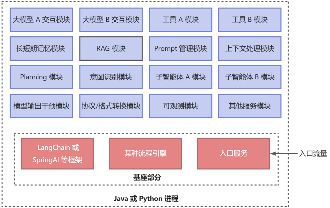 在这种架构下,基座沉淀了常见的 AI 编程框架或者某种流程引擎以及入口服务,而模块则封装了 AI 应用常见的各个子功能。基座与模块、模块与模块之间会有大量 0 开销的相互调用。