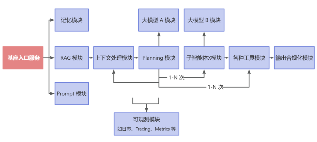 这里举一个例子:所有的入口流量进入入口服务之后,可以路由给记忆、检索召回、上下文处理等模块,进而请求可以继续路由流转至 Planning 模块或者意图识别模块,以调用大模型制定执行规划或者识别意图,最后经过各个子智能体模块和工具模块协同完成处理,整个过程支持多轮的循环处理。