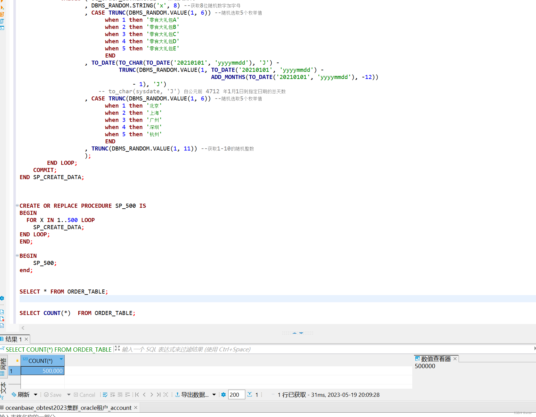 文章展示了如何在Oracle数据库中利用DBMS_RANDOM包生成随机值,创建了一个名为ORDER_TABLE的订单表,并定义了名为SE_ORDER_ID的序列。然后,创建了两个过程SP_CREATE_DATA和SP_500,用于插入1000条和500组随机订单数据,包括随机的订单ID、用户ID、商品名称、下单日期、城市和订单数量。
