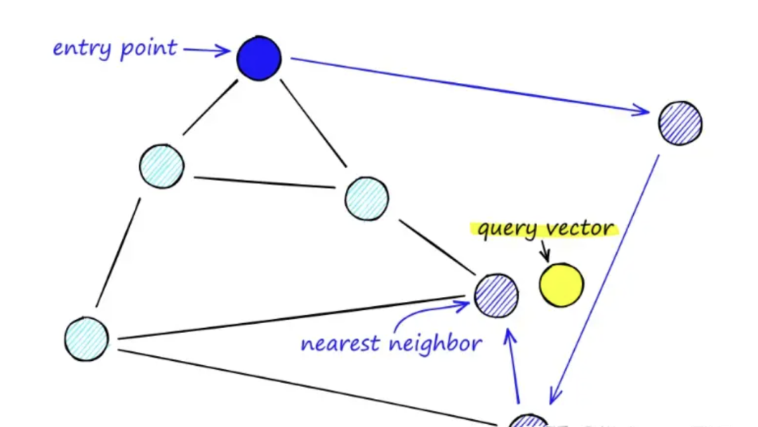 HNSW算法,将所有向量构建成一张图,根据这张图,搜索某个顶点附近Top K节点数据。索引构建时间慢,查询速度快。