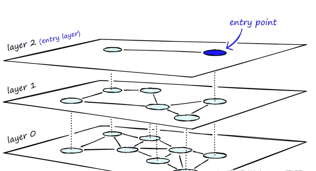 2、HNSW(Hierarchical Navigable Small World):基于小世界网络理论构建图结构,进行高效的近邻搜索。