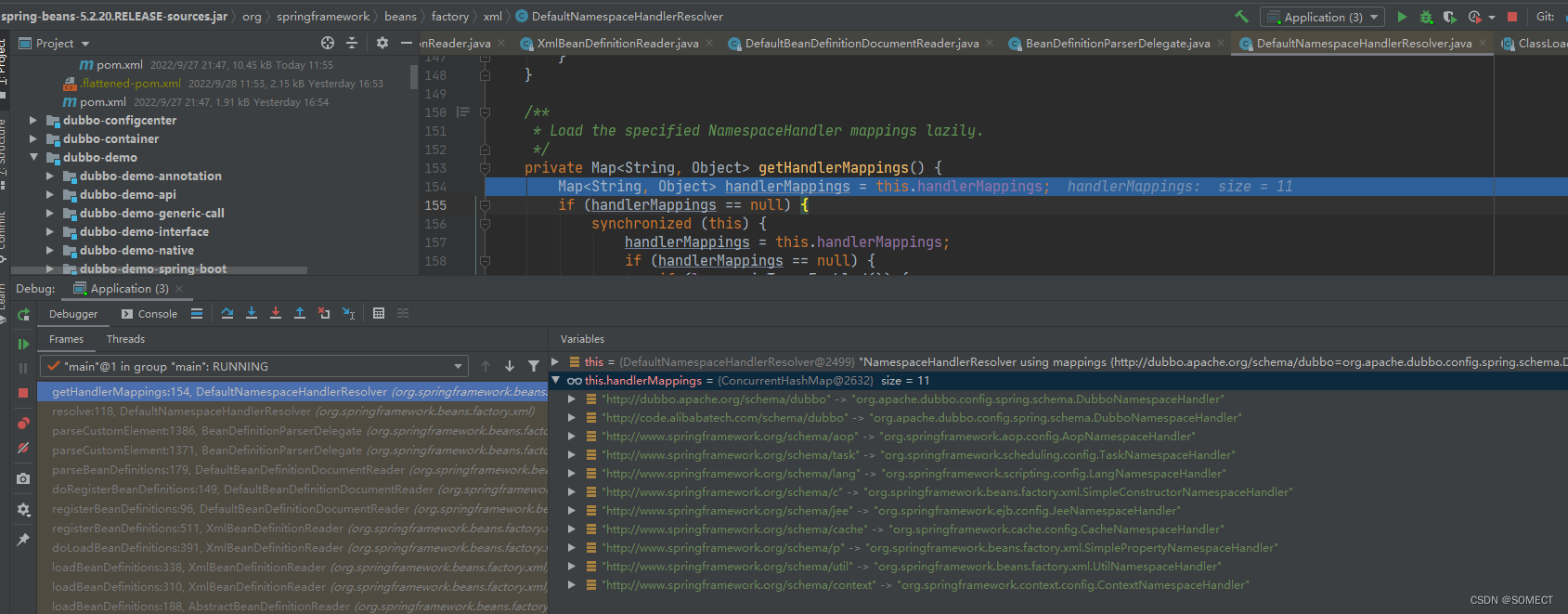 5.其中newResourceEntityResolver(this)通过PluggableSchemaResolver读取META-INF/spring.schemas文件内容。会加载所有该目录下的键值对内容放在map里。loadBeanDefinitions(beanDefinitionReader); 会继续执行,寻找到默认命名空间处理解析器DefaultNamespaceHandlerResolver.它去寻找/META-INF/spring.handlers文件。文件内容