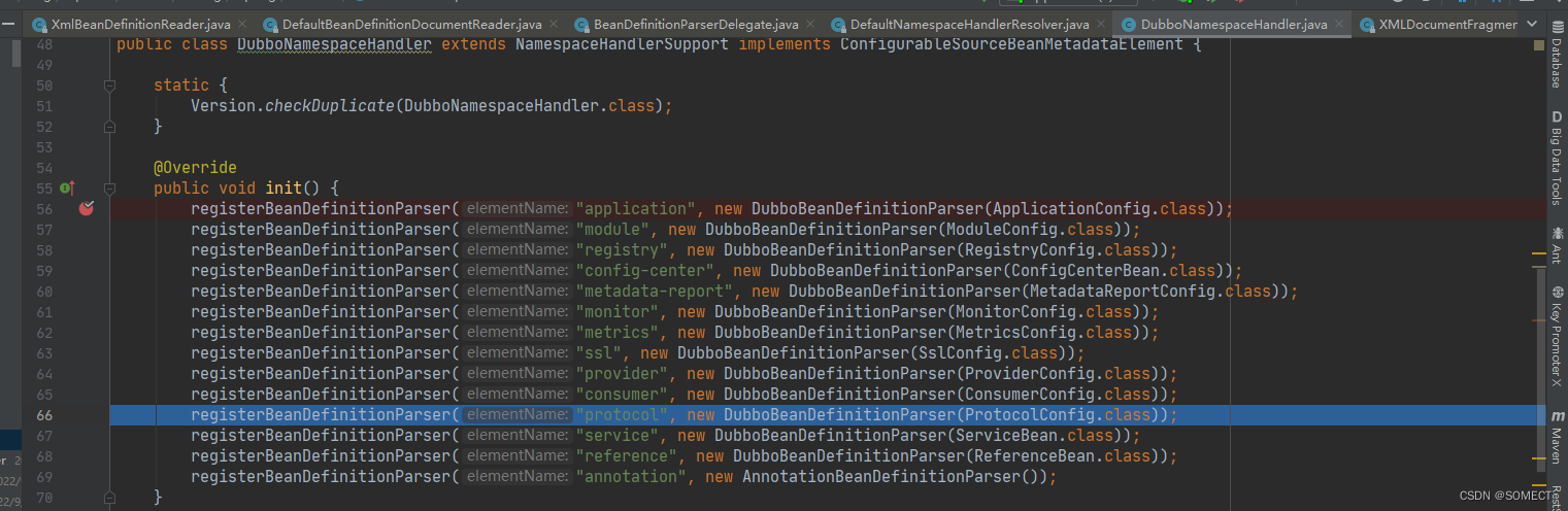 然后执行DubboNamespaceHandler 的init方法,并解析。