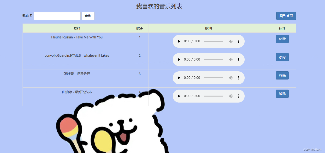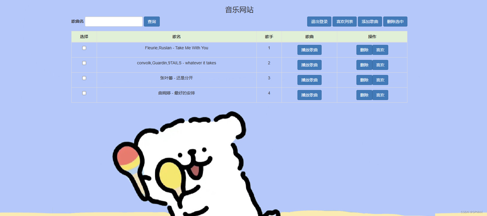 插入音乐、播放音乐、查找音乐、删除音乐、批量删除音乐功能(代码太长,实现逻辑都是一样的并不难,相关代码可访问上面开源代码网站)(播放音乐运用到了一个开源播放器网站,通过将将访问后端服务器/music/get接口的url地址保存到数据库,后续返回这个url给前端传入开源网站即让此网站访问我的音乐播放网站的服务器接口然后就可以播放了)。