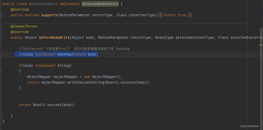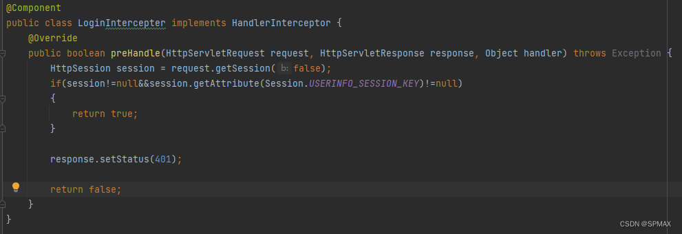 随后将自定义拦截器类加入统一拦截器类,需要设置若拦截成功,则设置http状态码为401并返回: