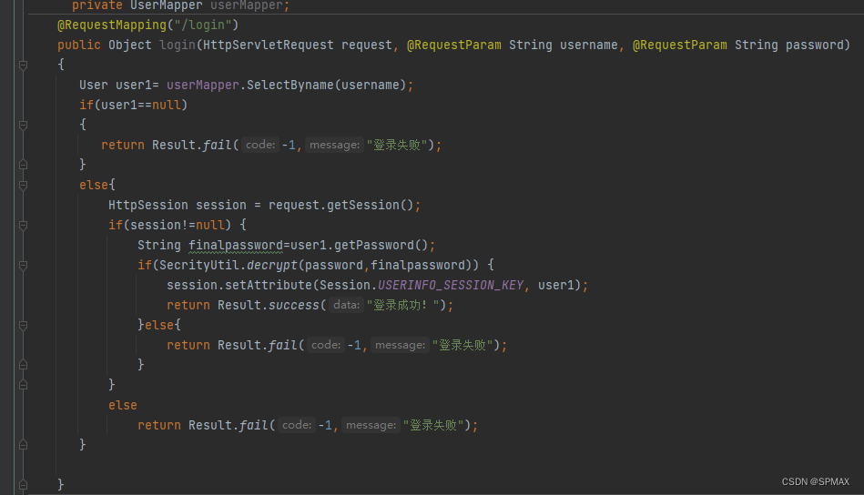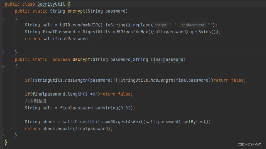 3.设置密码MD5 以及加盐处理,里面设置两个方法,第一个方法是将密码进行UUID加盐、然后调用DigestUtils类进行MD5加密且去除“ - ”字符后再拼接盐值得到一个64位字符串 ,随后设置decrypt进行密码校验,从数据库拿到finalpassword密码,与用户登陆时输入的密码进行比对,具体算法为:将finalpassword取前32位(MD5处理会生成32位字符串,UUID加盐也会生成32位字符串),然后结合用户传入的password进行拼接然后进行MD5处理,比对处理结果和finalword是否一致,如果一致则密码正确,否则密码错误!