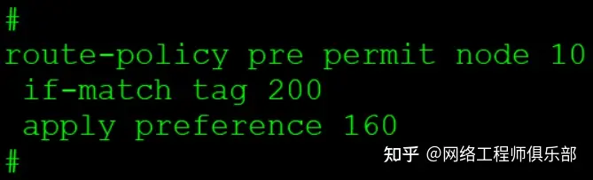 所以我们可以在R2上设置名称为“pre”路由策略针对携带tag 200标签的路由,在引入到OSPF之后形成的外部路由的优先级数值改为160。