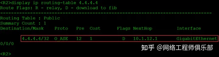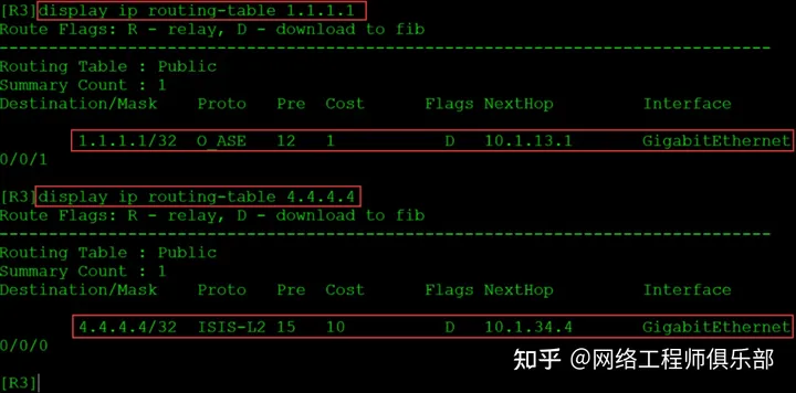 在R3上将ISIS的路由引入到OSPF中,由于,R2已经将OSPF的外部路由优先级数值改为12,所以,此时R2会在OSPF区域通过R1学习到优先级数值为12的4.4.4.4/32的外部路由。