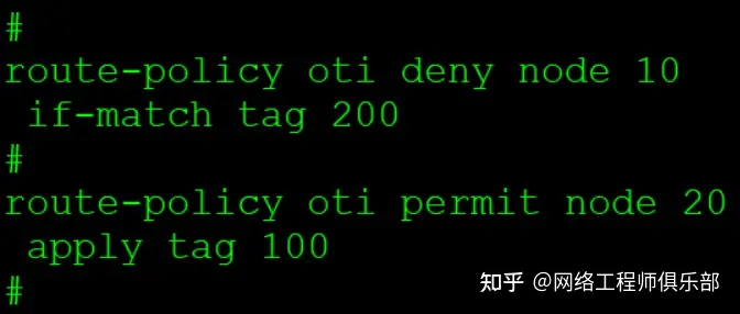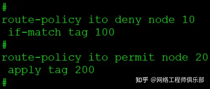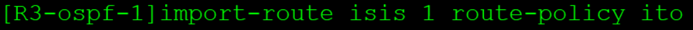 在R3上设置路由策略,将ISIS的路由引入到OSPF时,拒绝携带tag 100的路由引入,并将本身所属ISIS区域的路由引入到OSPF时打上tag 200的标签,路由策略如下图所示: