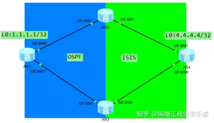 现在网络中左侧运行OSPF协议,并且为单区域0,右侧运行ISIS协议,ISIS建立level-2的邻居关系,并且为wide度量值风格。R1上存在一个环回口地址1.1.1.1/32,R4上存在一个环回口地址4.4.4.4/32。