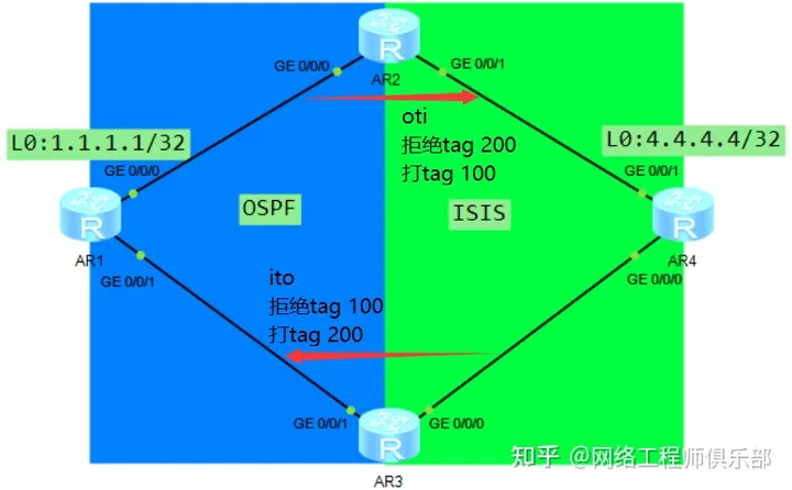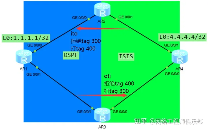 在R2上将ISIS引入到OSPF时打上tag 400的标签,在R3上将OSPF引入到ISIS时拒绝携带tag 400的路由引入,即从ISIS引入到OSPF的路由不会再引回到ISIS防止路由回馈,如下图所示。