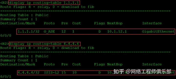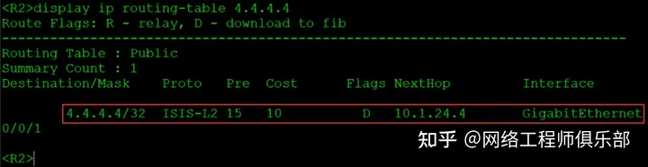 此时R2在访问ISIS区域的4.4.4.4/32的路由时,优先通过ISIS区域进行访问,如下图所示。