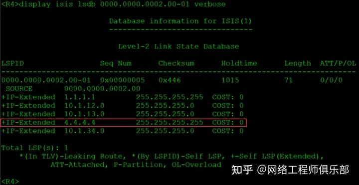 由于之前在R2将OSPF的路由引入到ISIS,所以4.4.4.4/32会再次引入到ISIS区域,R4会从R2学习到一条4.4.4.4/32的路由,形成了路由回馈,如下图所示: