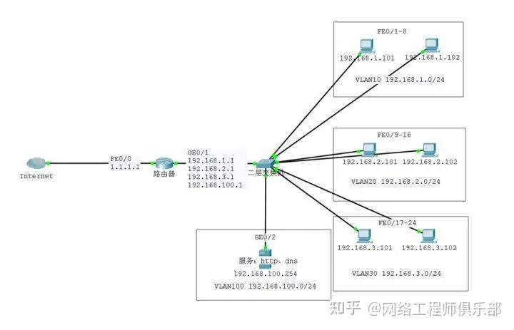 1841作为网关,提供路由、NAT、DHCP等服务,设置ACL限制VLAN间互访。