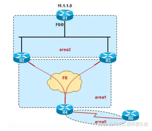 为什么R4去往11.1.1.0会出现负载均衡,正是因为虽然R2执行了7转5的动作,这条外部路由的5类LSA由R2产生,但是关键是这条LSA中包含的FA,为非空,那么R2收到的时候,去往11.1.1.0就不是往ASBR(这时候是R2)去了,而是奔着FA去,FA是R1的FA0/0口的地址,怎么去?