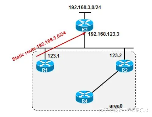 R1配了条静态路由,去往R3的LOOPBACK口,下一跳是192.168.123.3,随后,将静态路由无情的重发布进了OSPF。