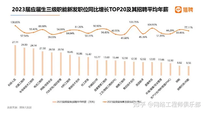 在 2023 届应届生新发职位同比增长最多的三级职能 TOP20 中,售后技术支持、科研人员、 带货直播位居前三,增长率为 133.75%、130.85%、104.93%。