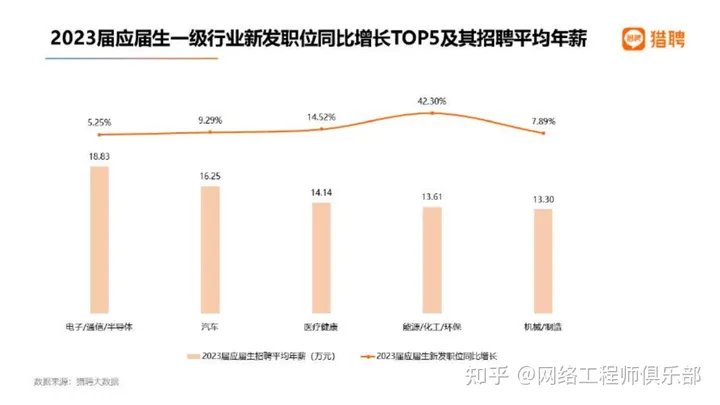 在这 TOP5 行业中,应届生招聘平均年薪最高的是电子/通信/半导体,为 18.83 万, 也领先所有一级行业。