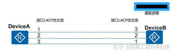 以DeviceB为例,当DeviceB收到DeviceA发送的报文时,DeviceB会查看并记录对端信息,然后比较系统优先级字段,如果DeviceA的系统优先级高于本端的系统优先级,则确定DeviceA为LACP主动端。