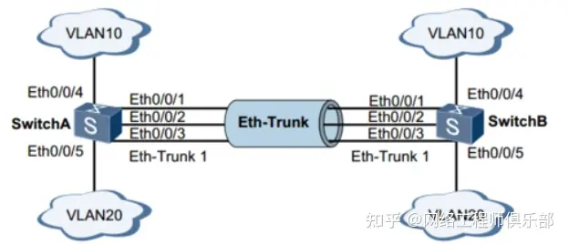 如上图所示,SwitchA和SwitchB通过以太链路分别都连接VLAN10和VLAN20的网络,且SwitchA和SwitchB之间有较大的数据流量。