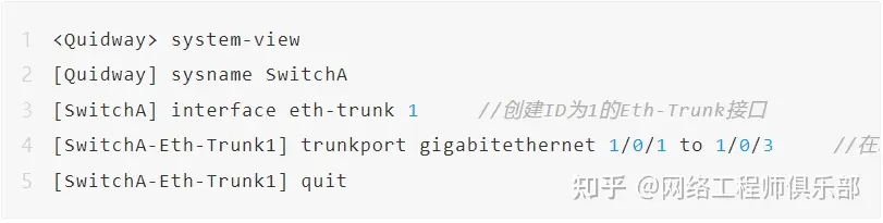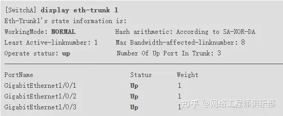 在任意视图下执行display eth-trunk 1命令,检查Eth-Trunk是否创建成功,及成员接口是否正确加入。