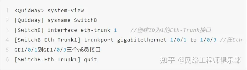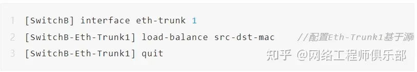 3、在SwitchA和SwitchB,配置Eth-Trunk1的负载分担方式。SwitchB的配置与SwitchA类似,不再赘述。