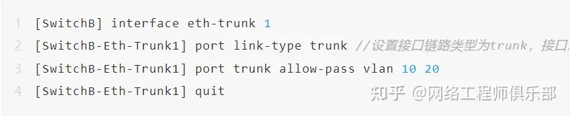 # 在SwitchA和SwitchB,配置Eth-Trunk1接口允许VLAN10和VLAN20通过。
