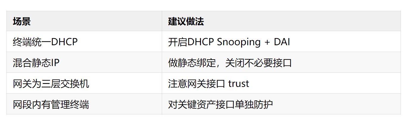 只要 DHCP Snooping + DAI + 静态绑定这三件事配合到位,ARP欺骗的空间就几乎为零。