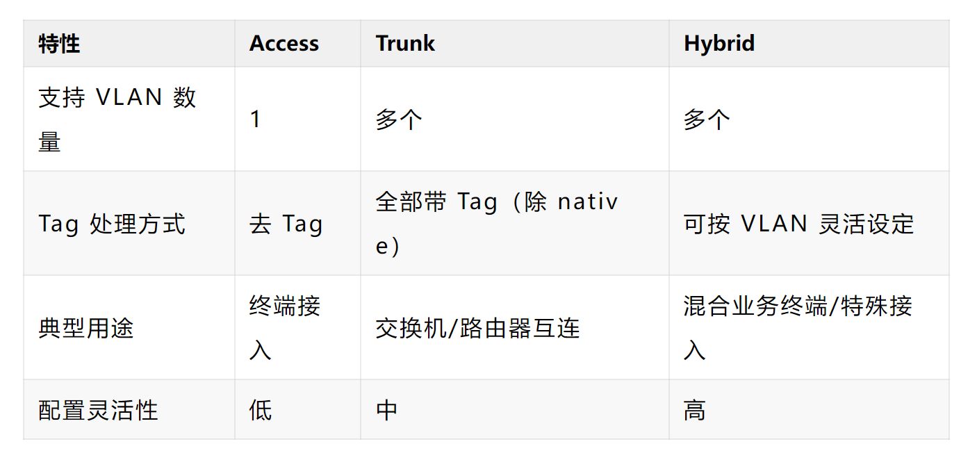 Hybrid:兼容 Access 与 Trunk 特性,灵活处理 VLAN Tag