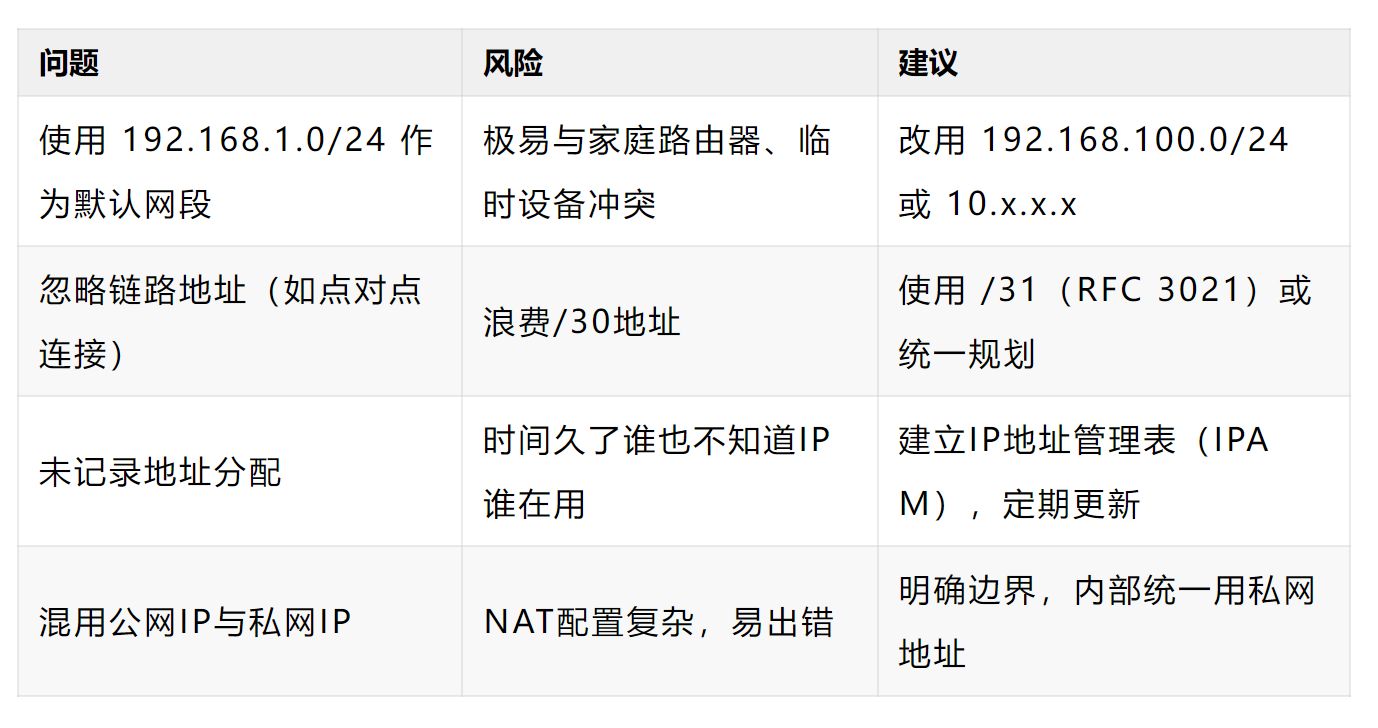 在工作中,相信不少不少网工朋友在初期规划时图省事、赶工期,导致后期问题频发:地址冲突、无法扩容、路由混乱、排查困难……