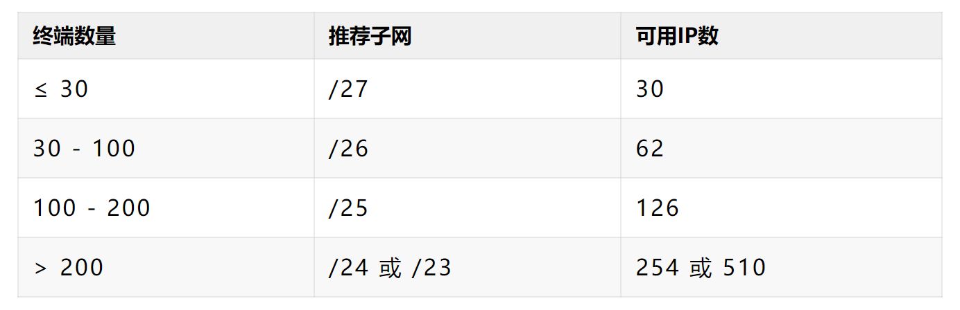★📌 提示:即使当前设备不多,也建议从 /16 或 /12 开始规划,避免后期“地址不够用”。