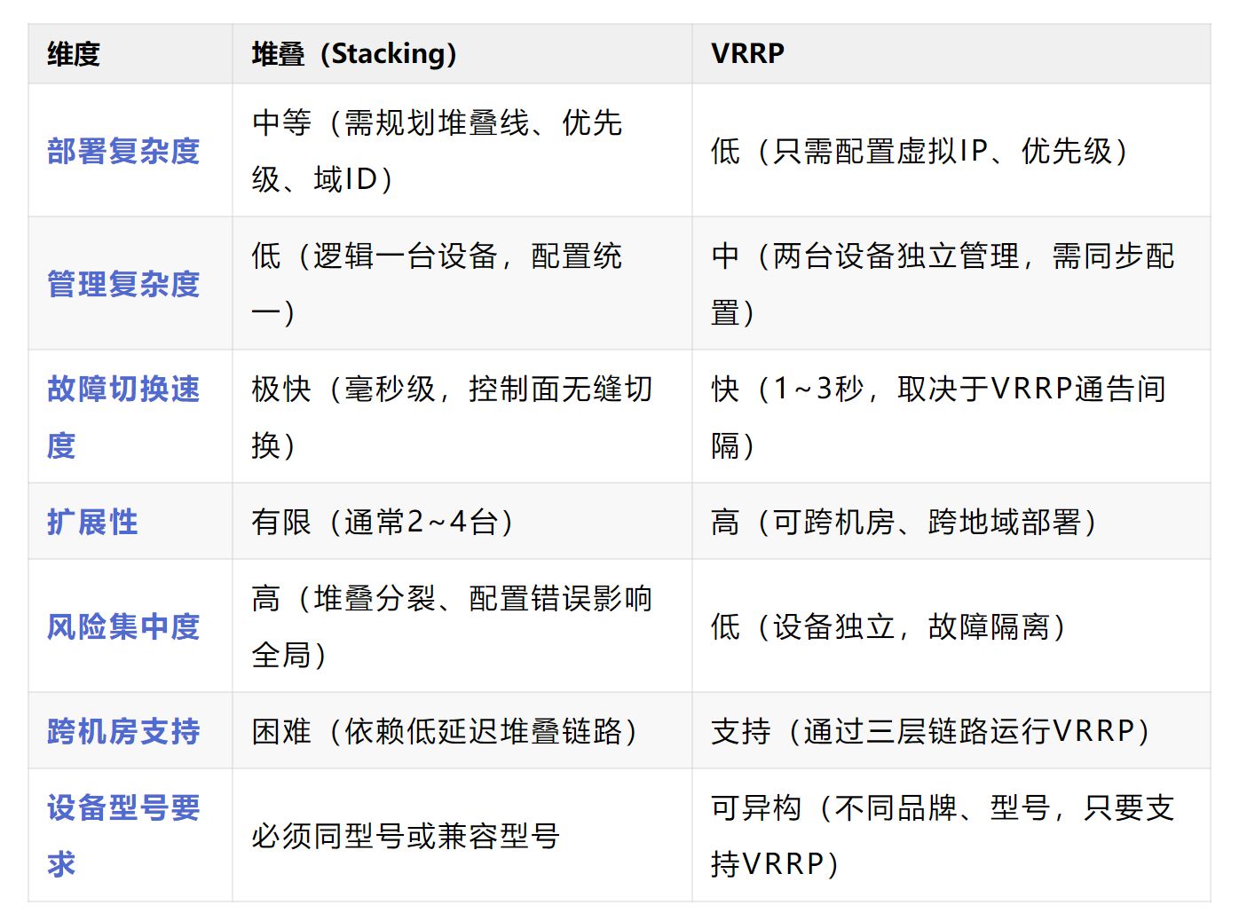方案适合谁?堆叠追求管理简化、高性能聚合、同机房部署的网络VRRP需要高可用、跨地域容灾、设备独立性的网络