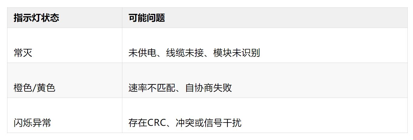 包括:线缆松动、接口污染、模块老化、电源异常等