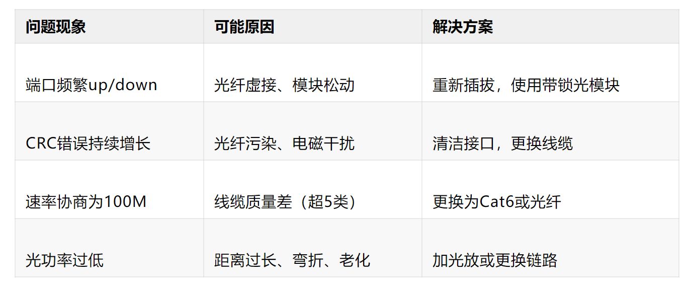 同时,建议将物理层巡检纳入日常运维规范,通过预防性维护降低故障率。