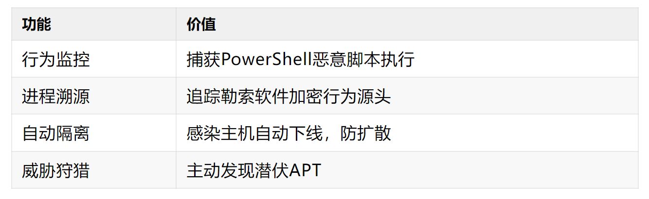 传统杀毒软件(AV)已无法应对无文件攻击、内存注入等高级威胁。