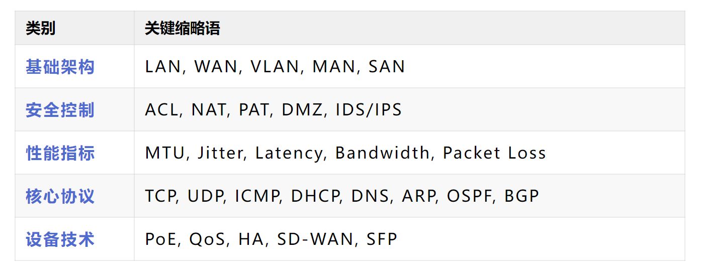 涵盖基础架构、安全控制、性能指标、协议技术四大类。